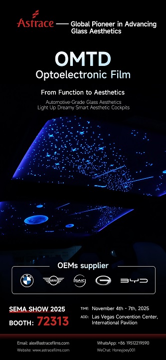 Complementing the 3MDT film is Astrace’s OMTD Optoelectronic Film, which elevates vehicle interiors from functional to aesthetic. This film enables dreamy, customizable ambient lighting for smart cockpits, turning car ceilings into dynamic canvases. As a trusted OEM supplier for brands like BMW, MINI, SAIC, and BYD, Astrace continues to redefine the intelligent experience of automotive glass.