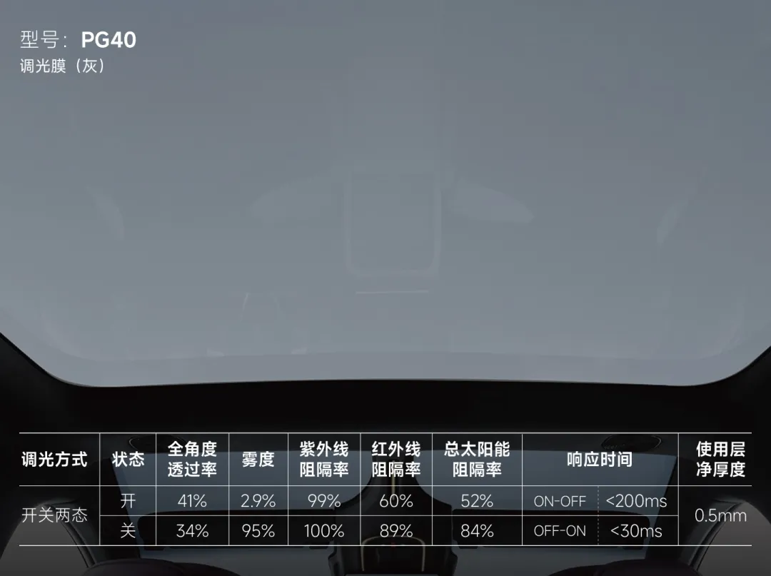 EC Technology (¥8000+): Offers excellent insulation and UV protection, but the color-changing process takes longer — about three minutes for a full panoramic roof to transition. It is currently a mainstream dimming solution used in both factory and aftermarket applications. For example, the Xiaomi YU7 Pro model also uses EC smart dimming glass.