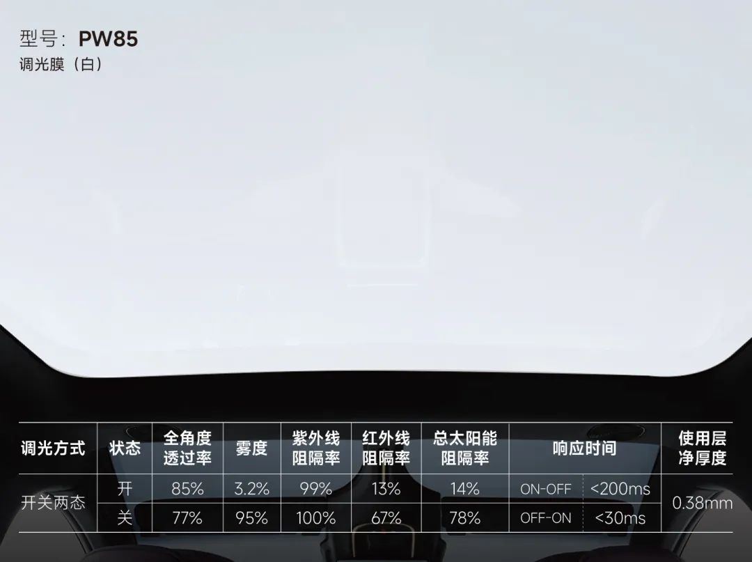 Compared with traditional PDLC technology, it features faster response, lower haze, and improved heat insulation and UV protection.